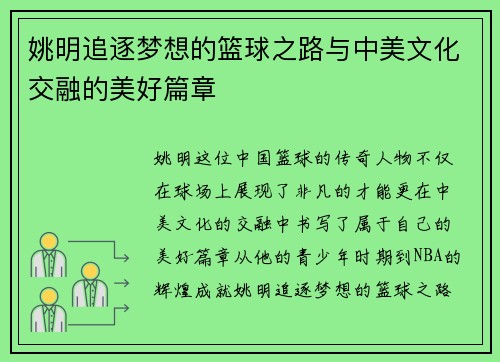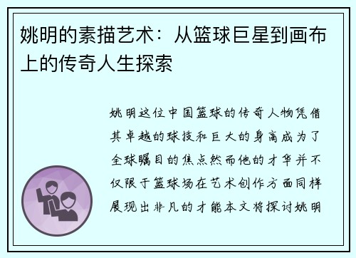 姚明,这位曾经的篮球巨星,以其卓越的球技和坚定的意志,不仅在国际赛场上为中国赢得了荣誉,更以身披战袍勇闯赛场的精神,展现了中国篮球的力量与辉煌。本文将从姚明的职业生涯、对中国篮球发展的贡献、他的影响力以及他所承载的文化象征四个方面详细阐述这一主题。通过这些方面,我们可以更深入地理解姚明如何成为中国篮球精神的代表,以及他对于后辈球员和整个社会所带来的深远影响。 1、姚明的职业生涯 姚明出生于198...