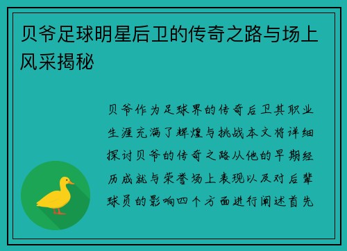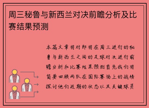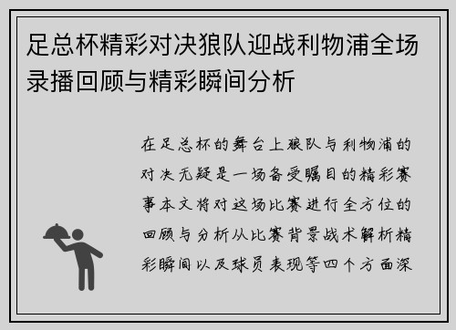 本文将深入分析加的夫城与女王公园在本赛季的精彩对决,并展望两队的赛季前景。首先,我们将从历史交锋记录出发,探讨两队之间的竞争关系和战术特点。接着,将分析双方在当前赛季的表现,包括各自的优势和劣势,然后讨论未来几轮比赛的重要性及其影响。最后,我们将总结加的夫城与女王公园在整体联赛中的定位以及未来可能面临的挑战和机遇。这篇文章旨在为读者提供一份全面、深入且专业的分析,以便更好地理解这场对决以及两支球队...